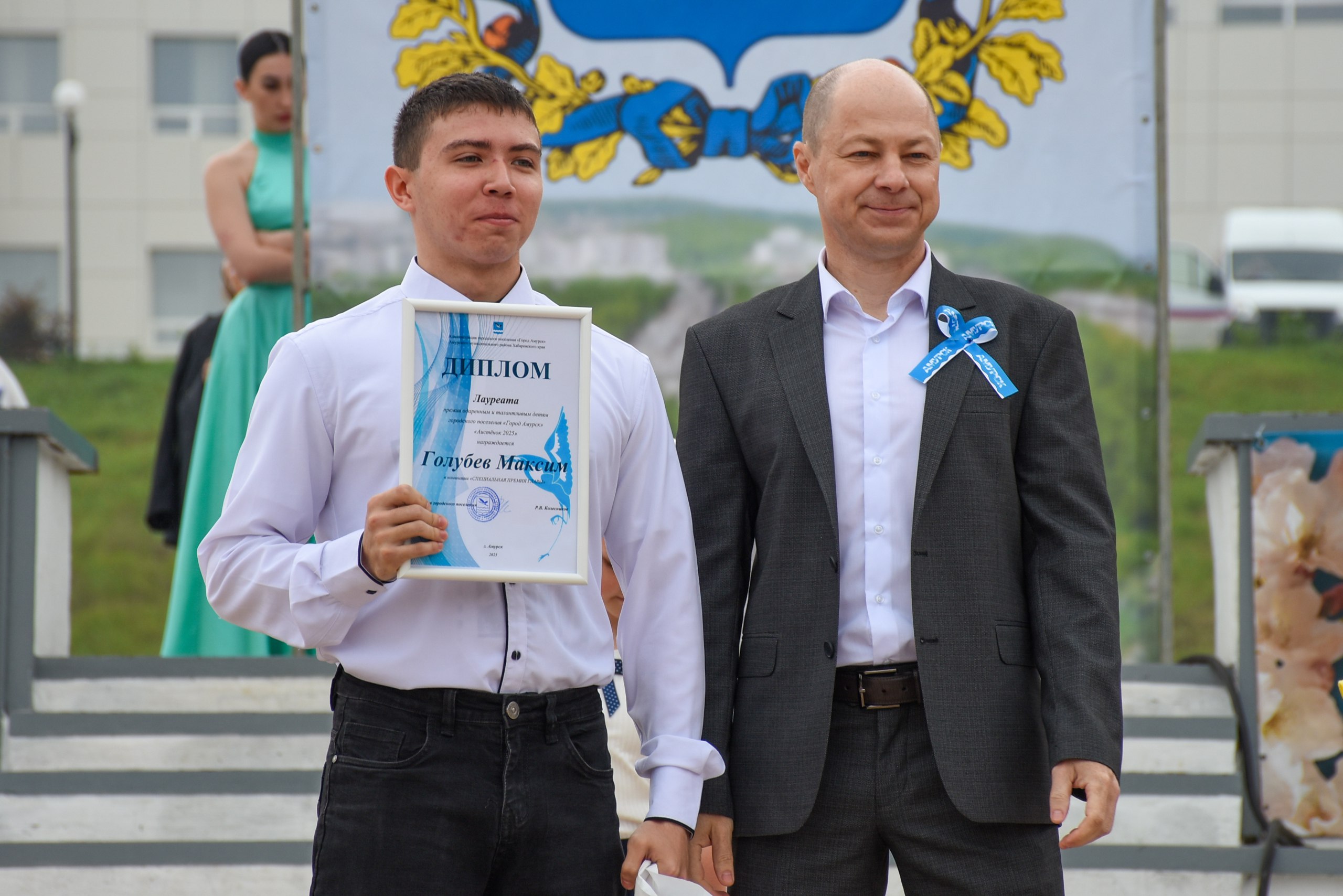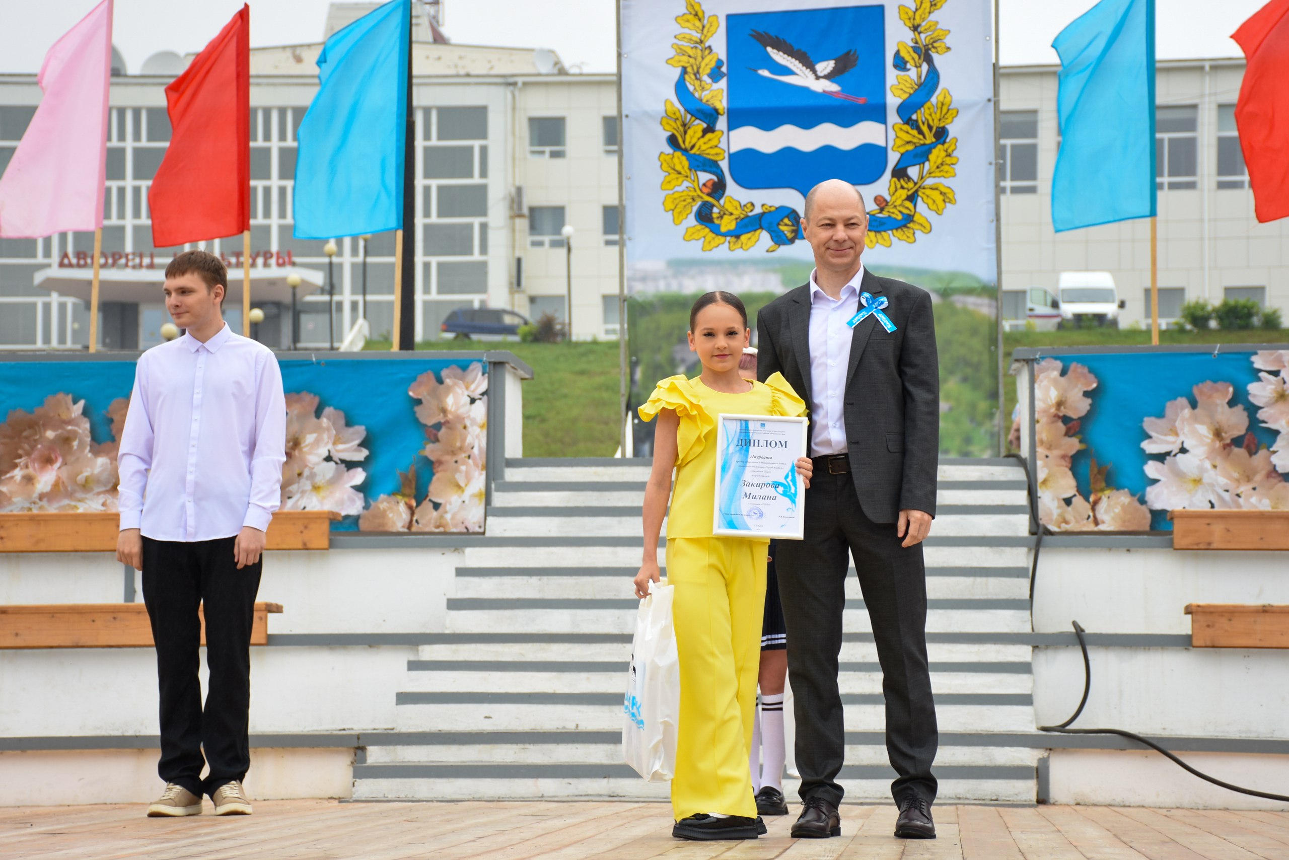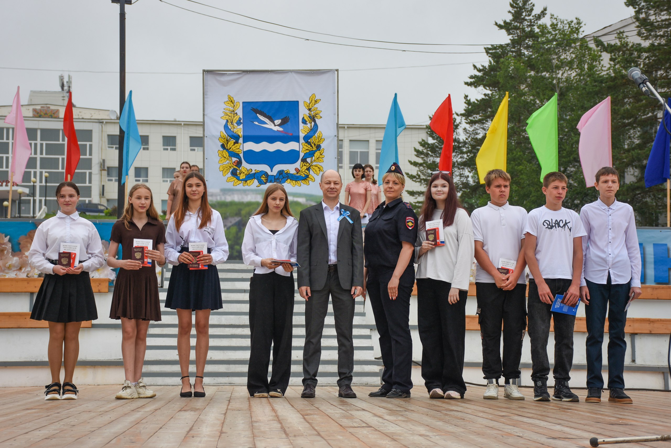Во время торжественной части празднования Дня города из рук главы города свои первые паспорта гражданина Российской Федерации получили 8 юных амурчан, а также были награждены 14 лауреатов в различных номинациях ежегодной премией для талантливых детей «Аистенок - 2025».
