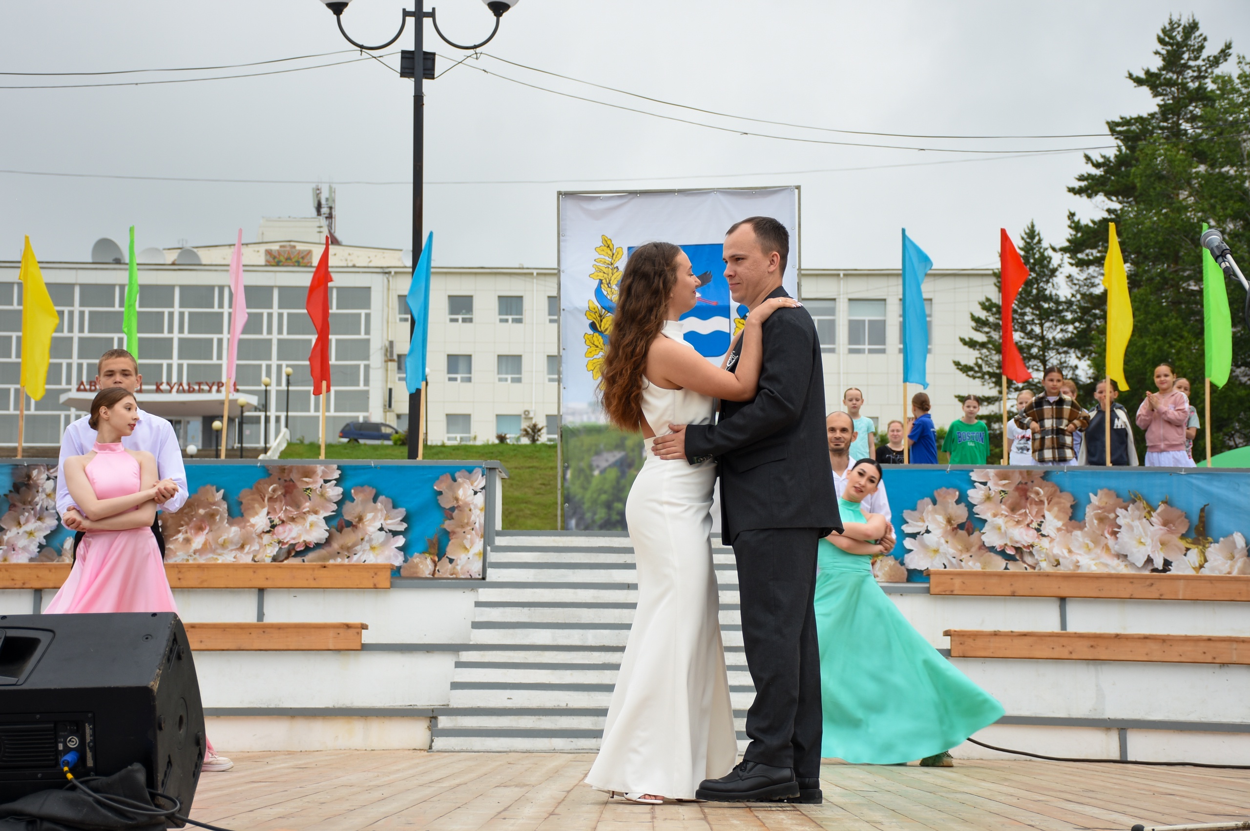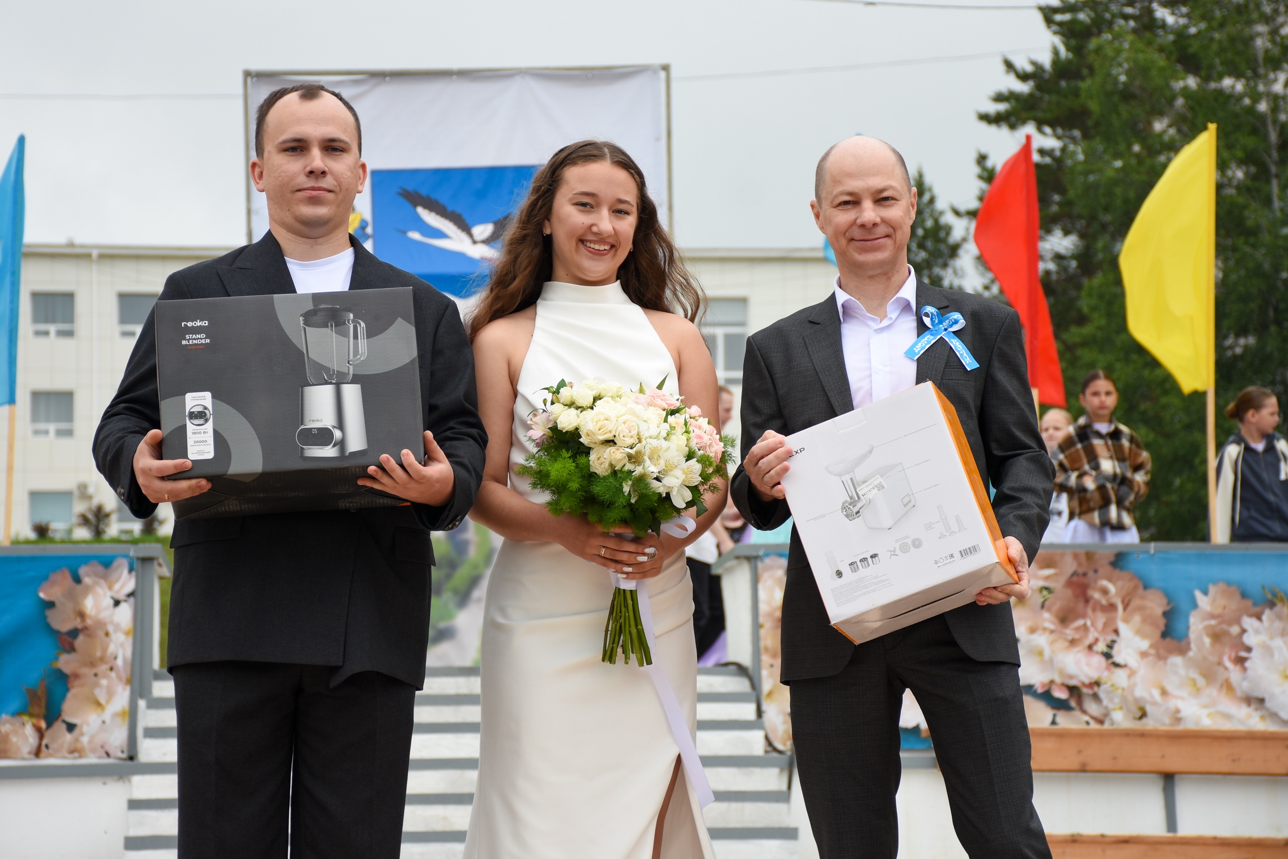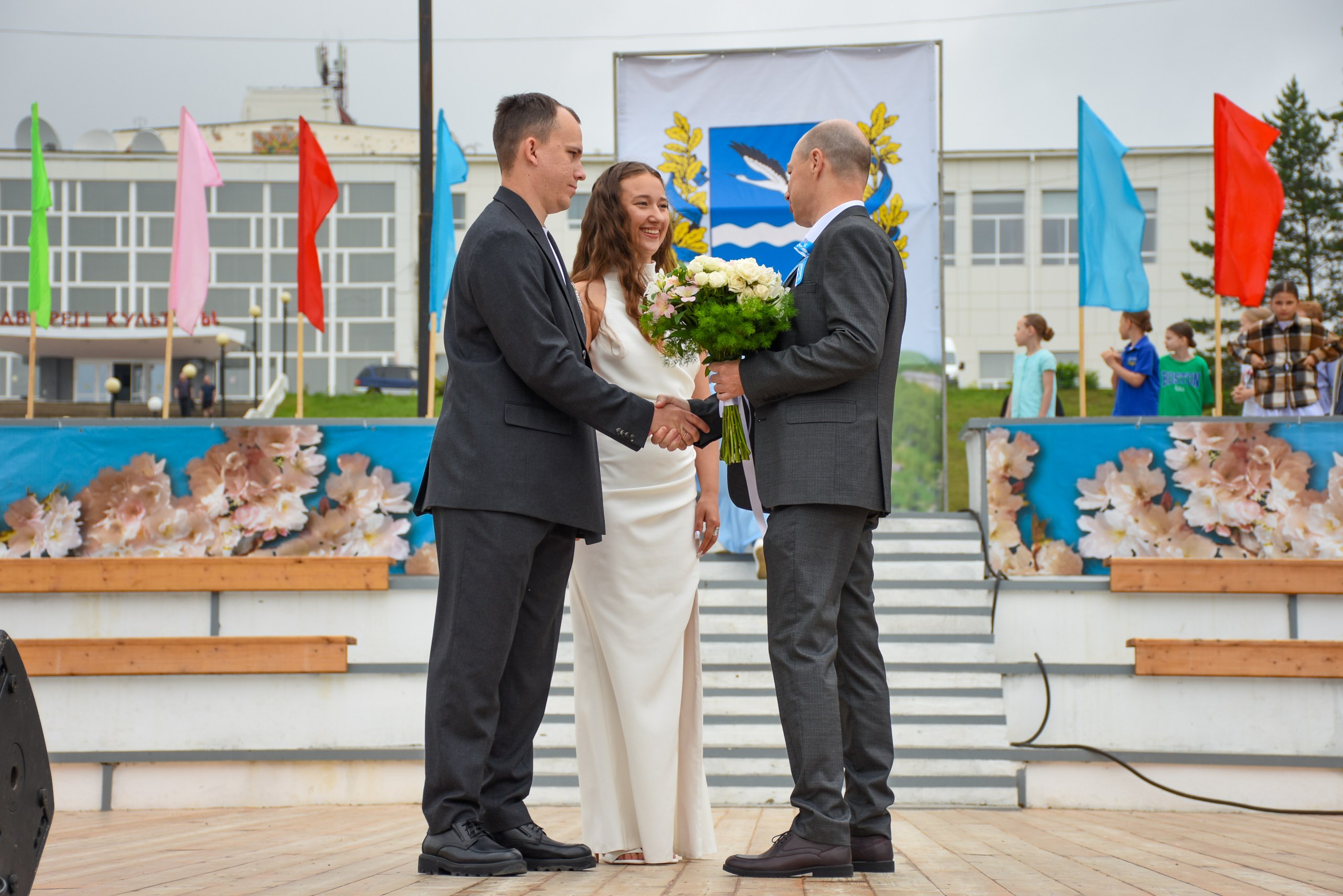 Не обошлось и без еще одной традиции так побившейся амурчанам - «Свадебный Амурск». Глава города Руслан Викторович Колесников с радостью поздравил новую амурскую семью Алису и Ивана Страут, вручил цветы невесте и подарки для молодой семьи.