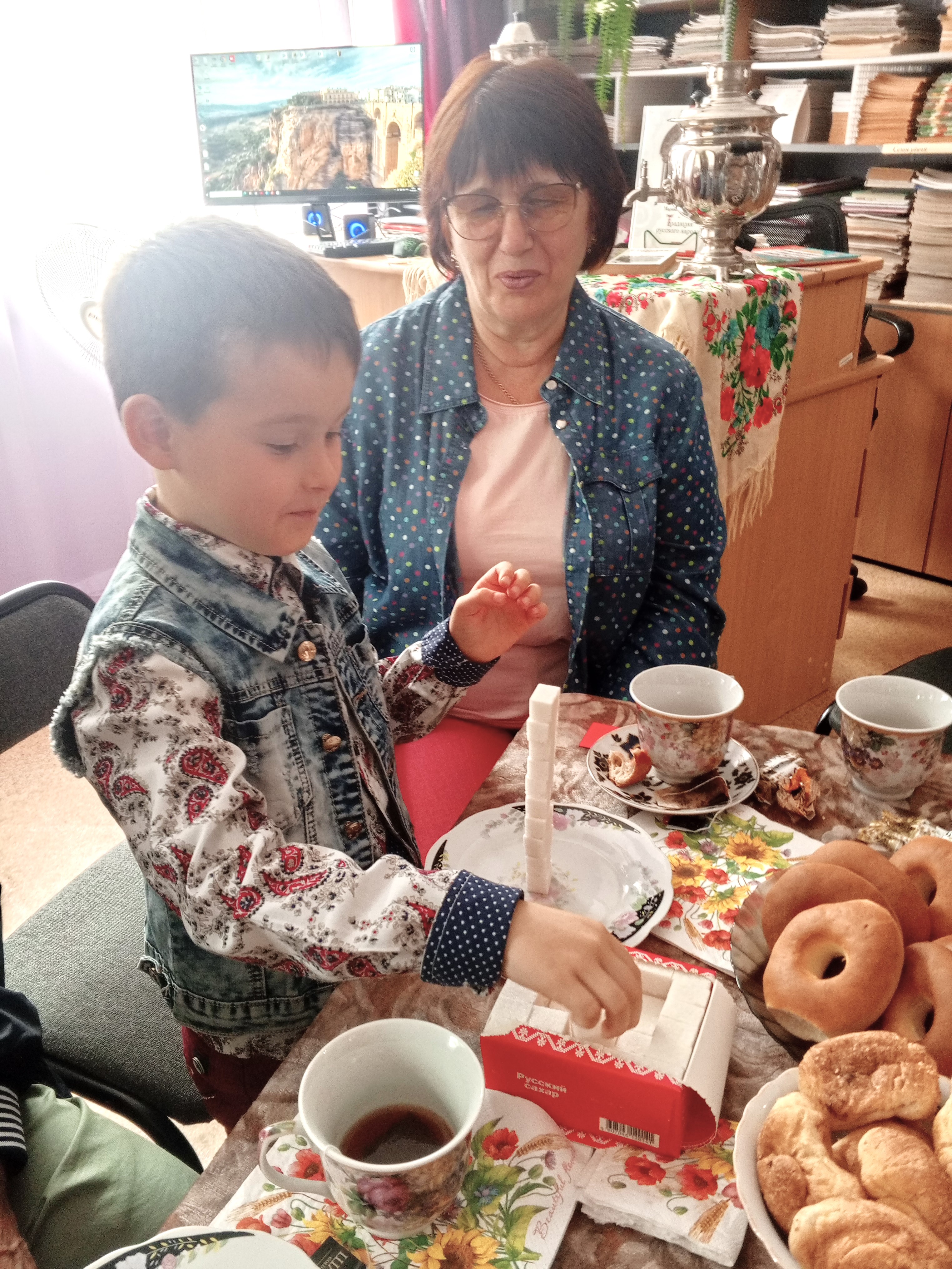 Для гостей был проведен виртуальный экскурс в историю возникновения чая на Руси, приглашённые пополнили запас знаний интересными сведениями о традициях чаепития, атрибутах чайной церемонии. Все вместе вспомнили полезные свойства чая, искусство его заваривания, отгадали загадки про чай, ответили на вопросы чайной викторины, провели дегустацию чайных напитков. Так же гости с удовольствием принимали участие в различных конкурсах: «Чайный круг», «Сладкоежка», «Не перепутай», «Пирамида из «рафинада»», «Сахарное казино».