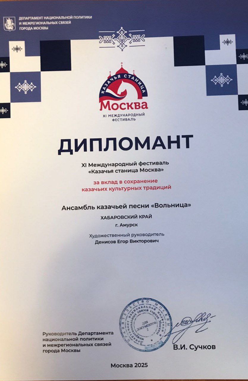 Фестиваль «Казачья станица Москва» – это масштабный праздник, который объединил казачьи общества, коллективы со всех регионов нашей необъятной Родины. Хабаровский край, Амурский район, город Амурск на фестивале достойно представил ансамбль казачьей песни «Вольница» Дворца культуры, руководитель Атаман Хутора «Вольный» Егор Денисов.