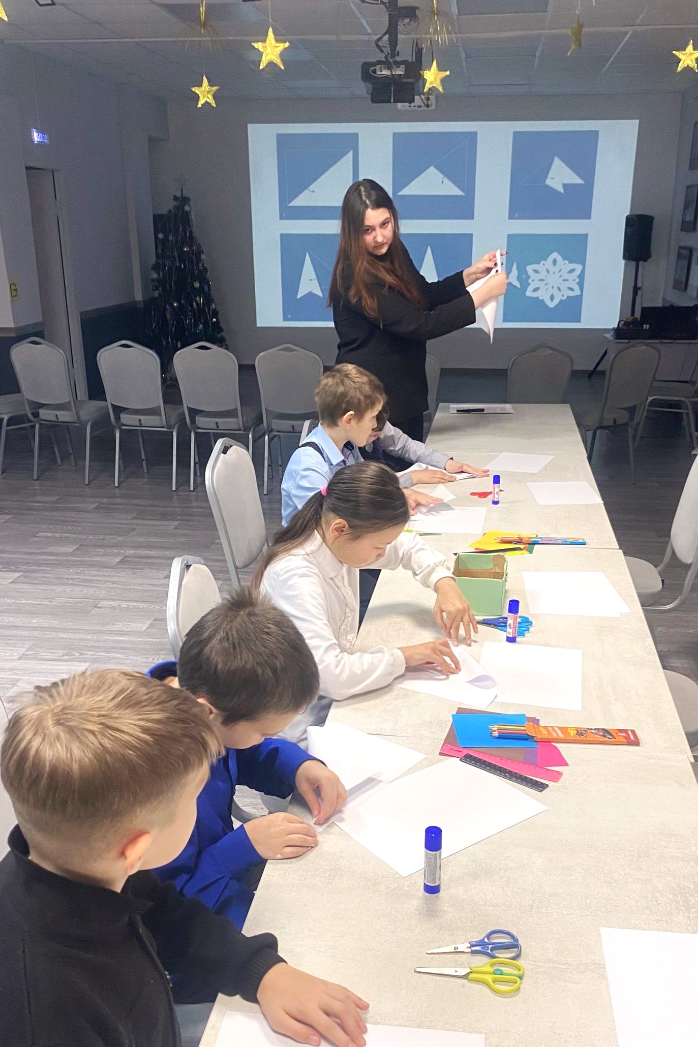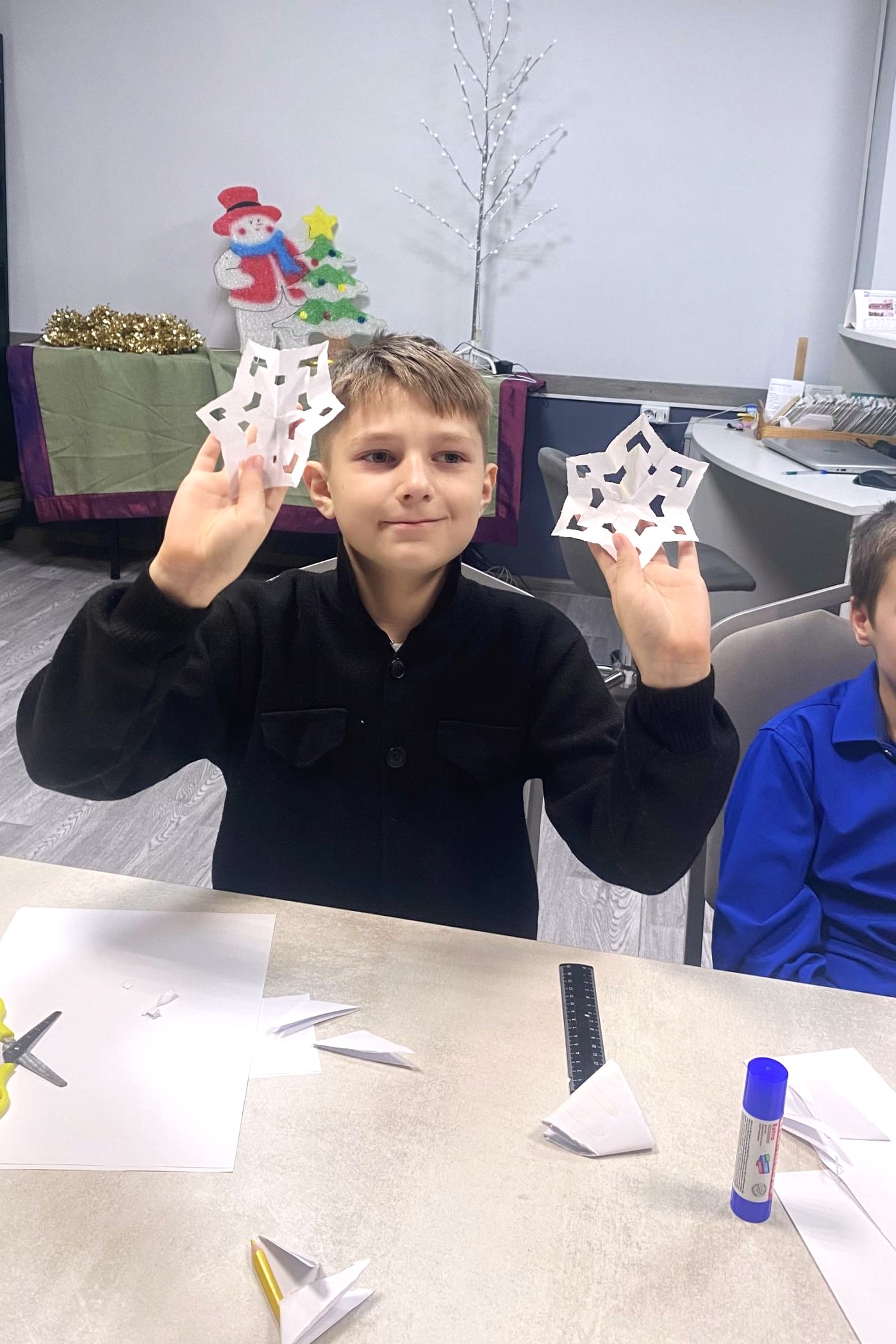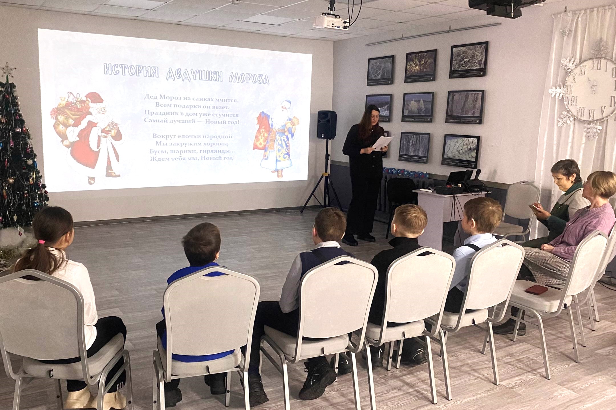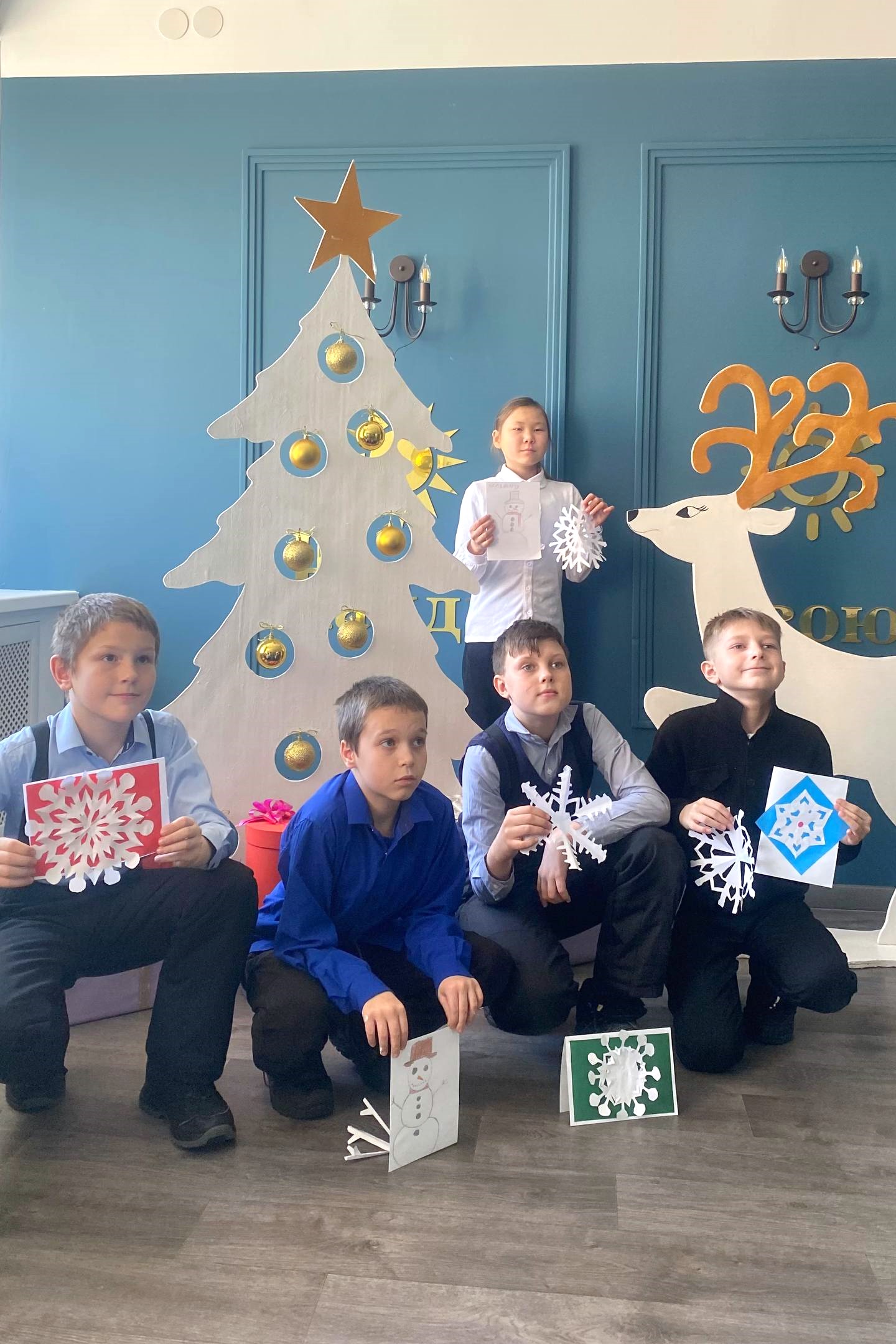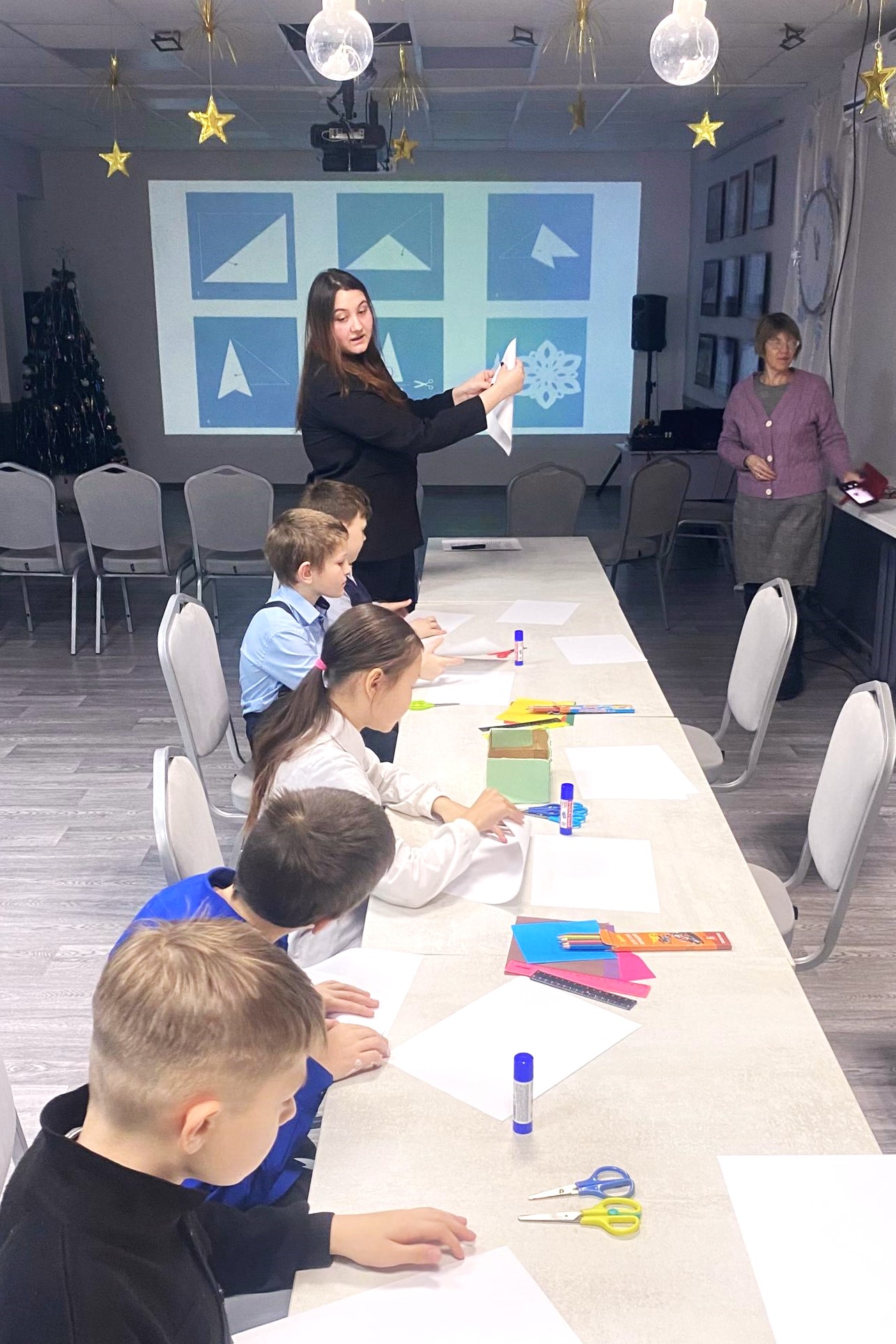 Ребята узнали об истории праздника, приняли участие в викторинах и отгадали загадки, после чего из бумаги вырезали снежинки и украсили ими открытки для Дедушки Мороза.